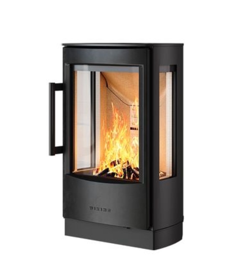 The large glass door and side windows create an inviting panoramic flame view, while the discreet handle maintains the stove’s minimalist look. An efficient combustion system delivers clean, effective heating, and the plinth base adds convenient space for storing firewood.